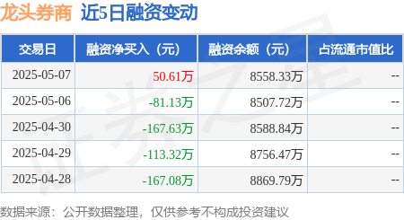 本站消息,5月7日,龙头券商(159993)融资买入802.78万元,融资偿还752.16万元,融资净买入50.61万元,融资余额8558.33万元。